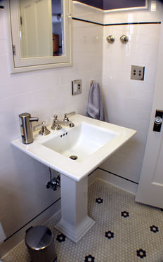 It was necessary for everything in Jason and Jennifer’s bathroom to be replaced due to lead paint, mold, and broken plumbing. To keep the vintage bungalow look while offering a modern touch, they chose new subway and daisy pattern tiles, pastel wall color, and even an old-style push-button light switch. For more functional storage, they creatively made the adjacent hallway closet accessible from both outside and inside the bathroom.