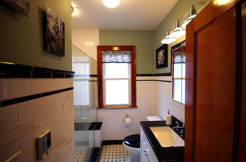 A 1950s remodel of Steve and Alice’s bathroom left outdated plastic tiles, crumbling plaster walls, inefficient plumbing fixtures, and damaged woodwork. Steve and Alice restored the bathroom’s woodwork and followed a tile and fixture scheme that honors the era when their bungalow was built. At the same time, they made practical updates like replacing the rarely used bathtub with a safe and accessible shower, replacing plaster walls with water-resistant wallboard, and choosing retro plumbing fixtures with water-saving features.