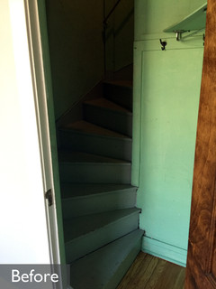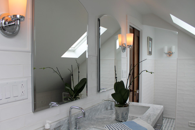 Brigitte wanted to finish her attic without adding dormers (to preserve the bungalow's exterior) so that when her parents can no longer live alone, they know the space is theirs to call home. A beautiful, up-to-code, custom staircase now leads up to loads of skylights, 2 bedrooms, as well as 1 glorious master bath. Charming historic details are sprinkled throughout, such as re-used existing attic doors now used as space-saving pocket doors leading into the bathroom.