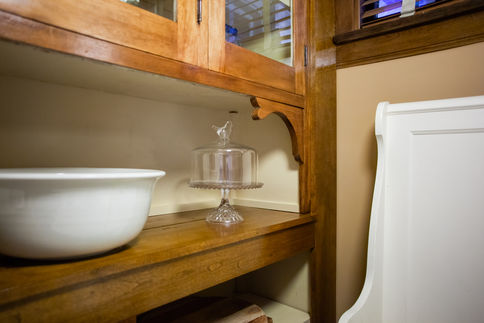 For 25 years, Michael and Karen searched for an original built-in to fit the empty space where their pantry once was. At a garage sale, they finally found the perfect one salvaged from a neighboring bungalow. Michael stripped its 8 layers of paint, stain and shellac, rebuilt the missing cabinet base, then re-stained and installed it in what is now the charming vintage breakfast nook they’ve always wanted.