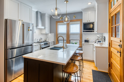 Lighting + Barstools: West Elm Appliances: Abt Electronics Window Treatments: 3-Day Blinds Faucet + Knobs: Ferguson Shelf Brackets: Signature Hardware
