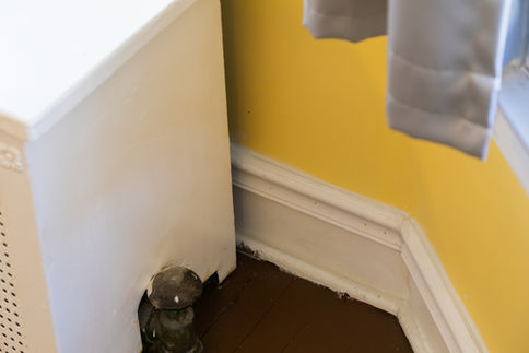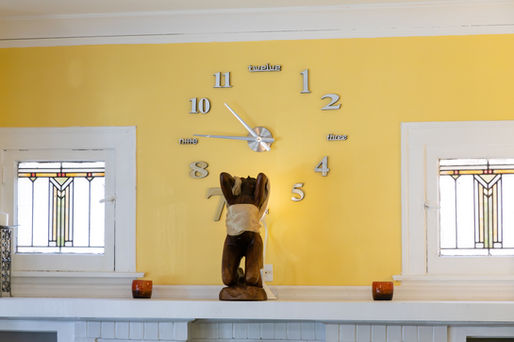 The living room and entryway of the Etheredge bungalow had cracks in the original plaster walls and ceiling. After filling the cracks, the walls were smoothed and repainted, preserving the vintage material while giving the space a refreshing update.