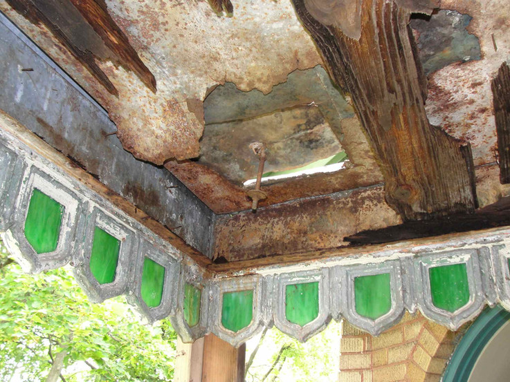 Local artisan and bungalow owner, Frank Glapa, restored his bungalow's original "marquee" entrance overhang. As a metalworker, he was able to save money by doing all the work himself: shoring up the sagging marquee with new chains, building a new framework to replace the old wood framework, adding new sheet metal and soldering all parts, and stripping the old paint around the stained glass. View more photos here.