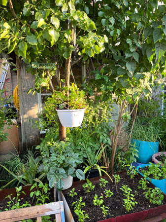 Because we still want to have space for our kids to play, we have to utilize containers and vertical space to grow things. This year, we moved a big portion of our garden to the front yard where we have peas, beans, cucumbers, and herbs growing on an arch from raised beds. Our potatoes and broccoli are grown in pots so we can easily move them to have more space for play, or to accommodate the plants' needs.